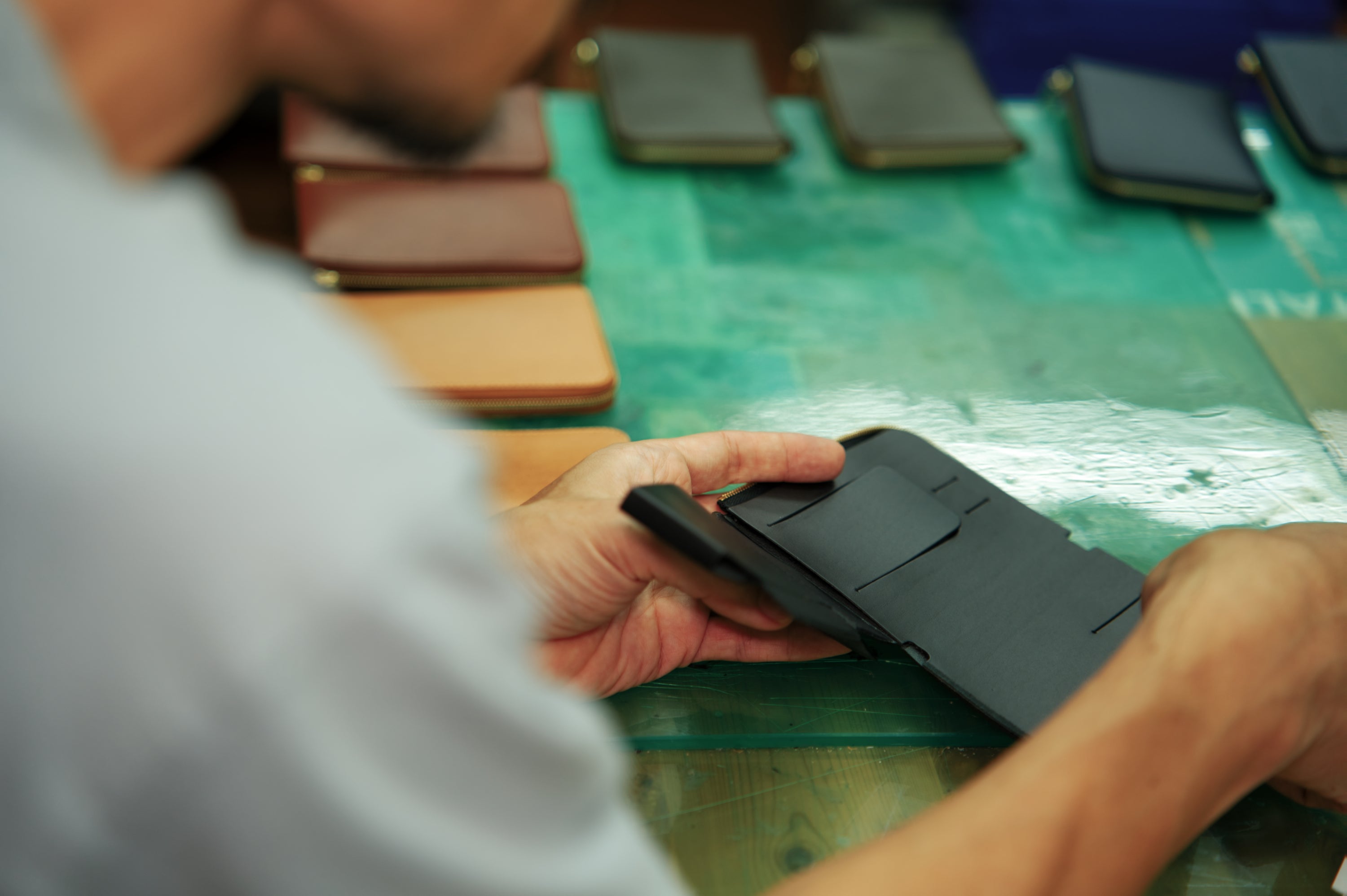 スマートフォンケースに挟んで使える専用ジョイントも付属。回転式カラビナフックで、財布だけでなくスマホも肩掛けできます。